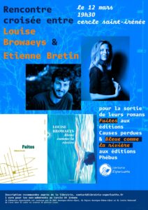 Jeudi 12 mars à 19h30 au Cercle Saint-Irénée Conversation autour des deux livres -Bleue comme une rivière de Louise Browaeys,...
